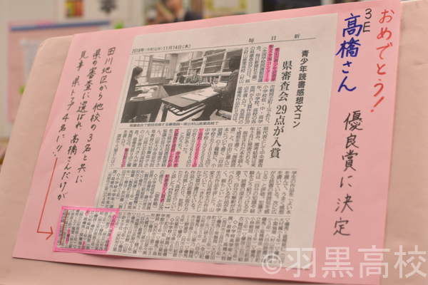 羽黒高校だより 読書感想文コンクールの県審査で生徒が優良賞を受賞しました